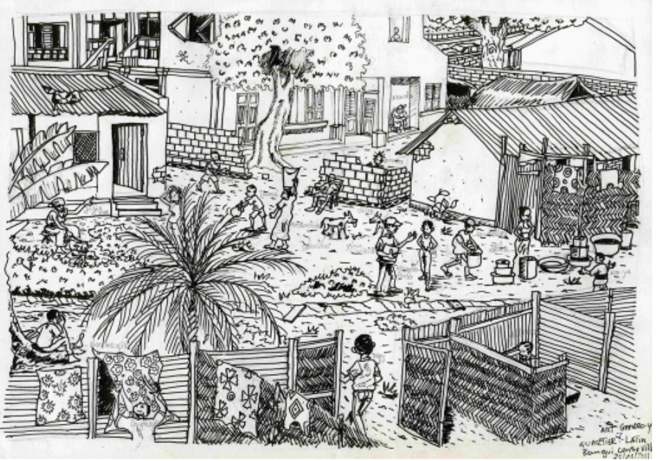 © Illustration de couverture de ma thèse, par Yvon Gandro « Quartier Latin Bangui Centre-ville », dessin crayon et feutre, Atelier Vision d’Art, 2011, 30 x20 cm